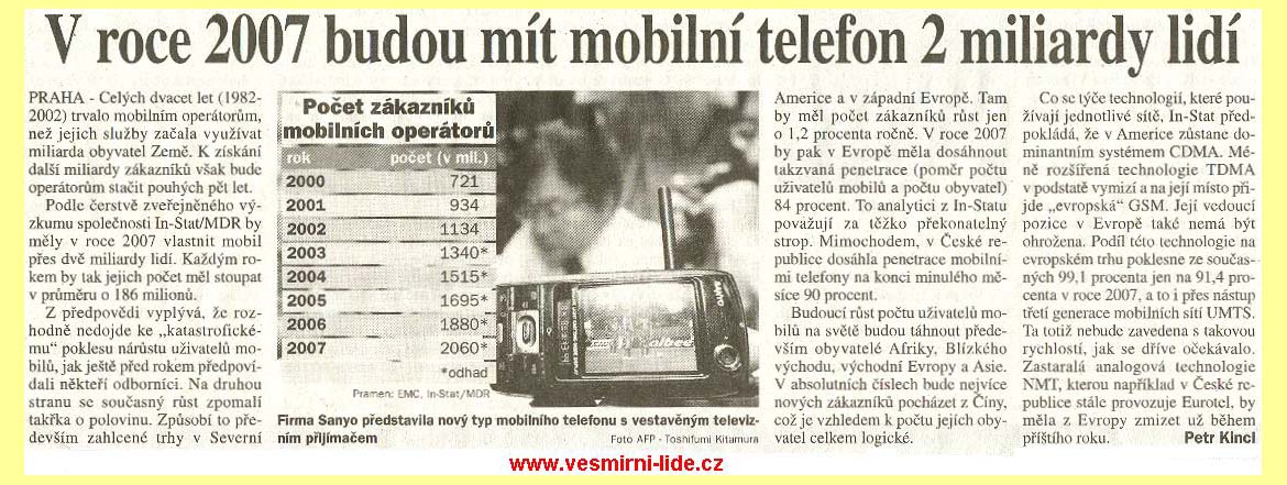 147 tn_147.jpg (2423 bytes)V roce 2007 budou mít mobilní telefon 2 miliardy lidí (2003)