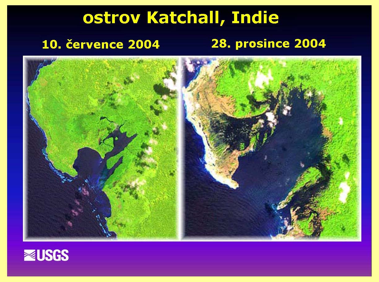 Srovnání satelitních snímků indického ostrova Katchall (Nikobarské ostrovy) z července a prosince 2004. Už na první pohled jsou patrné rozdíly, které způsobila katastrofální vlna tsunami.
